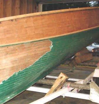 The heat gun definitely works to lift the old paint, at least on the inside where it appears it was painted over varnish. I cranked it up to 1100 degrees F, the highest setting, and the paint first starts to blister and then gets scorched bumps on it. After that it will lift off in limp strips. Under the paint, the old varnish turns into a goo, and it's pretty tough to scrape very much of that off. So another sanding step will be needed to get down to bare wood. I noticed that where it appeared that paint was applied to weathered wood, probably without any varnish on it, the paint was sticking a whole lot more. It will be more work to get that paint off the oak ribs.
